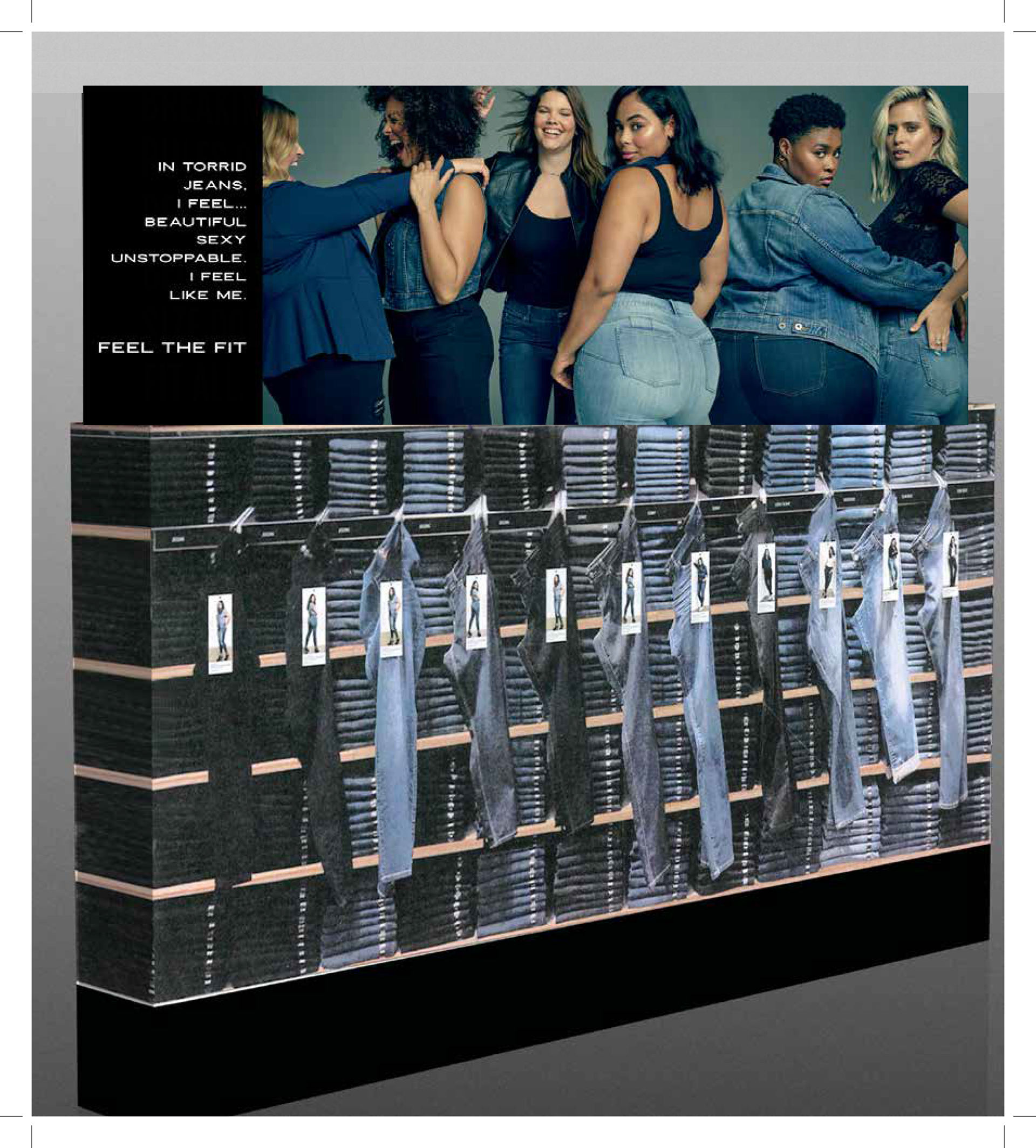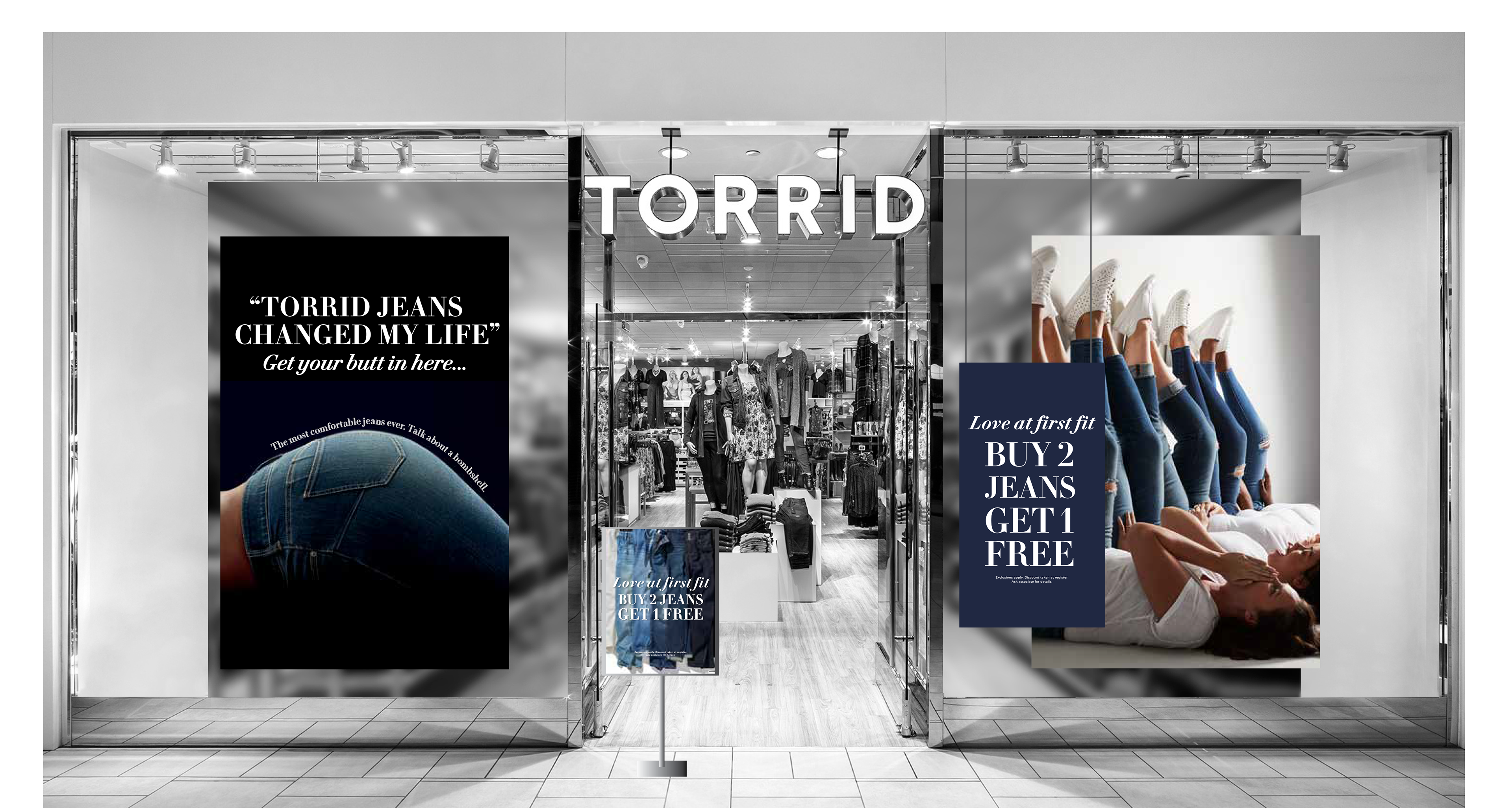 Spring window banners for in store visuals. Window signs for Curve Intimates and Denim promotional sale. Back wall denim showcase with supporting merchandise.